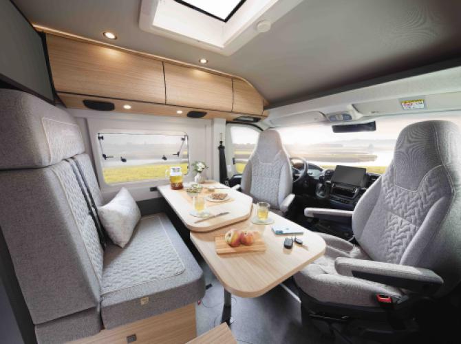 | Voorzijde | Zitgroep met bij te draaien voorstoelen in ruime Coupé stijl en de luxe cabine. |