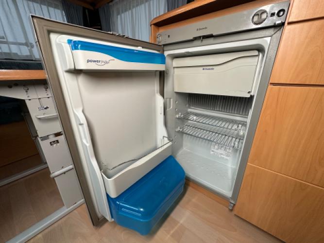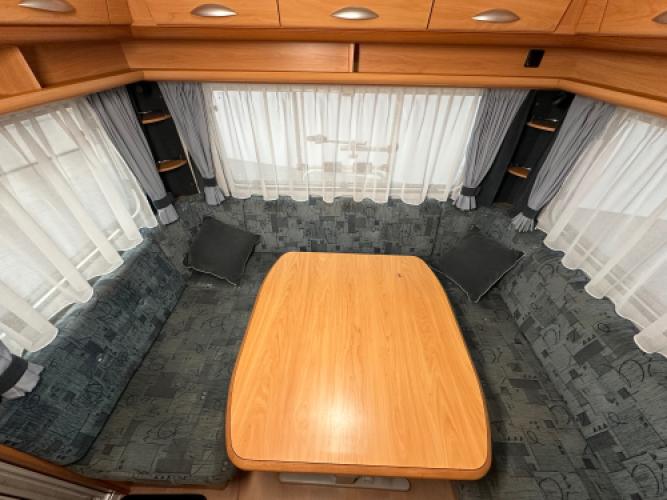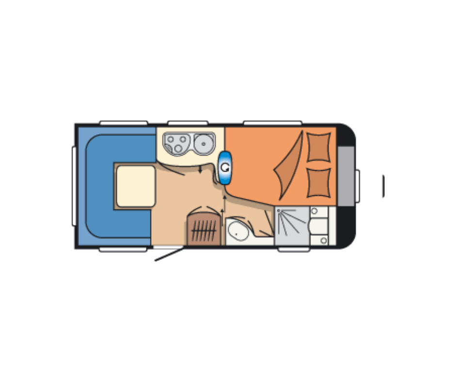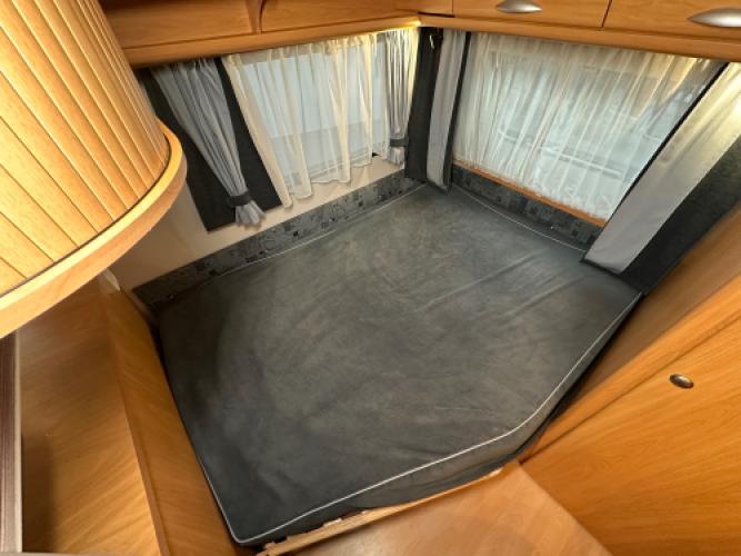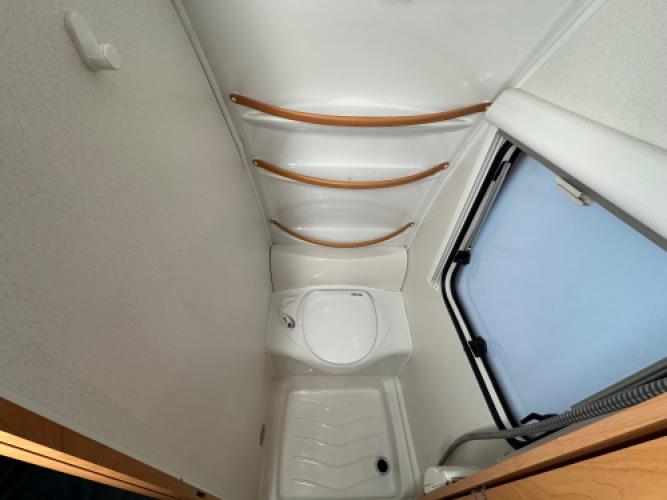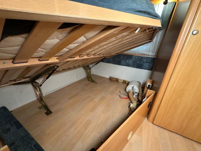 | Voorzijde | Frans bed met hieronder veel opbergruimte, daarnaast de toiletruimte en een externe wastafel. |