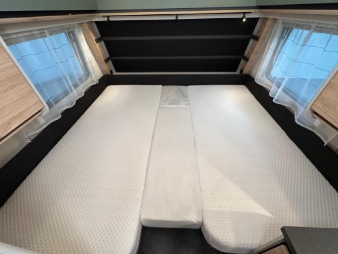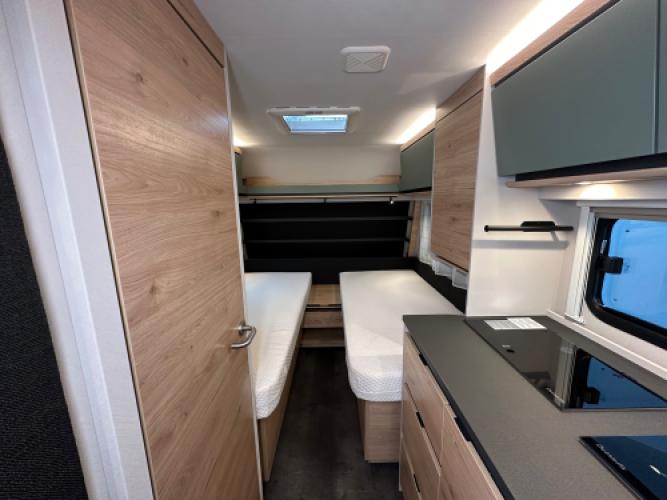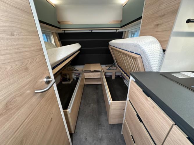 | Voorzijde | Enkele bedden + rolbed met hieronder veel opbergruimte. |