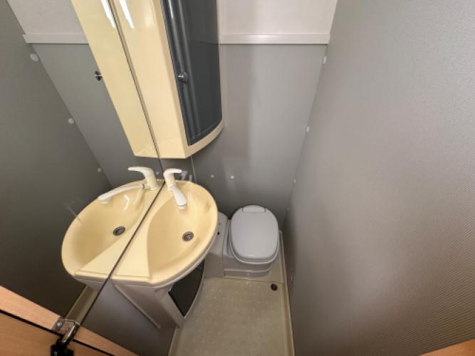 | Achter | Treinzit met in de hoek de badkamer. |