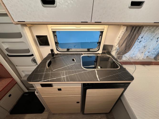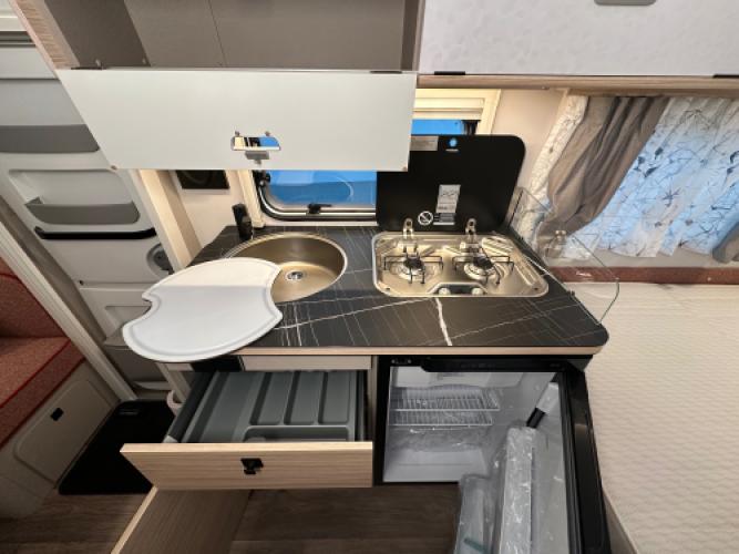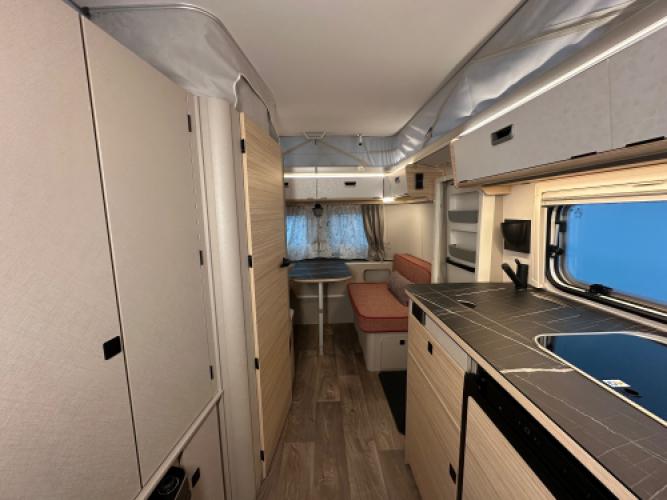 De Eriba Touring 530 Tango Red is een speciale uitvoering binnen de Touring‑lijn, met een opvallende White/Tango Red buitenkleur en de herkenbare retro‑vormgeving. De 530 is een van de ruimere modellen, licht van gewicht en voorzien van het bekende hefdak voor extra ventilatie en stahoogte. Dit exemplaar is ongebruikt, ideaal voor wie direct met een nieuwe caravan wil vertrekken. Het interieur heeft een moderne, verfijnde uitstraling dankzij het chroompakket en de Urban‑accenten. Praktisch detail: de caravan is uitgerust met afneembare lampen, die flexibel inzetbaar zijn voor extra licht of sfeer.