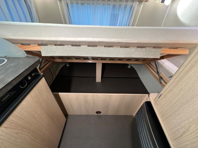 | Voorzijde | Comfortabel vast tweepersoonsbed met hieronder een grote, gemakkelijk te bereiken opbergruimte. |