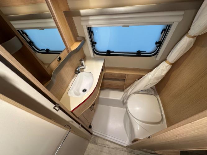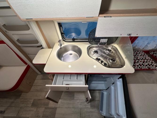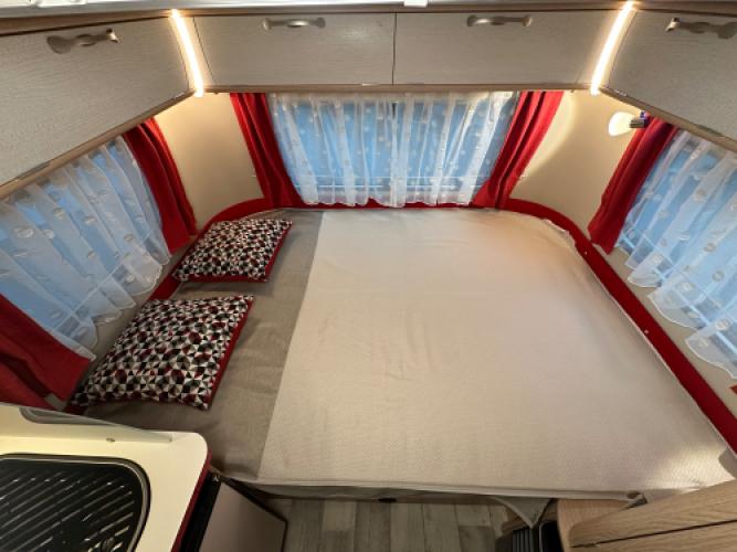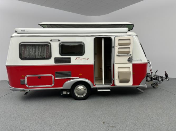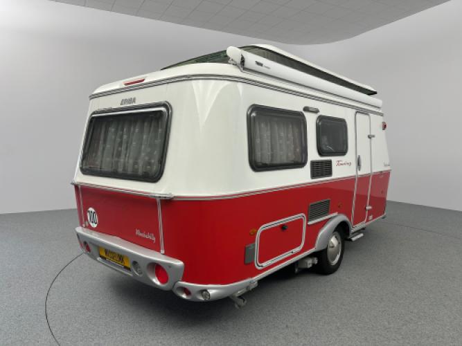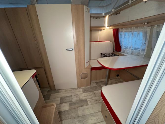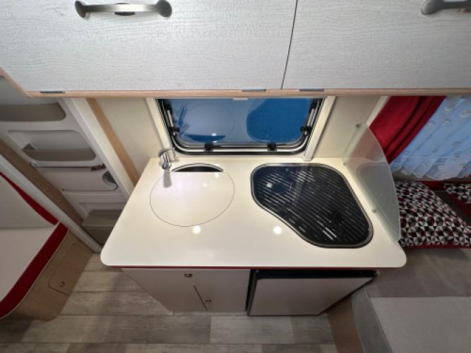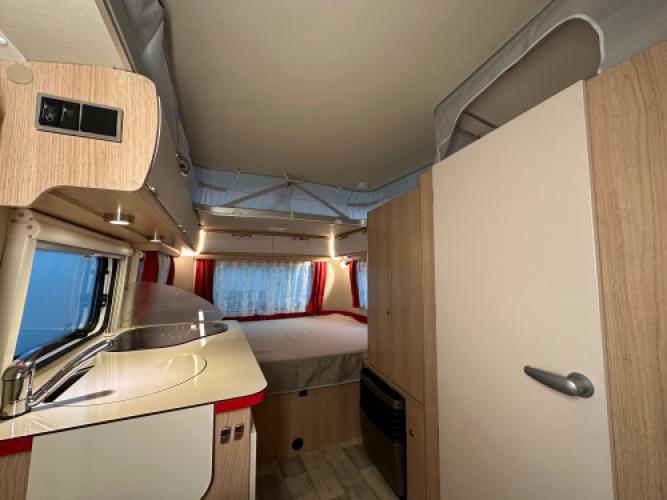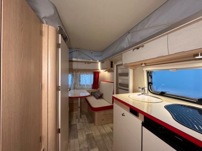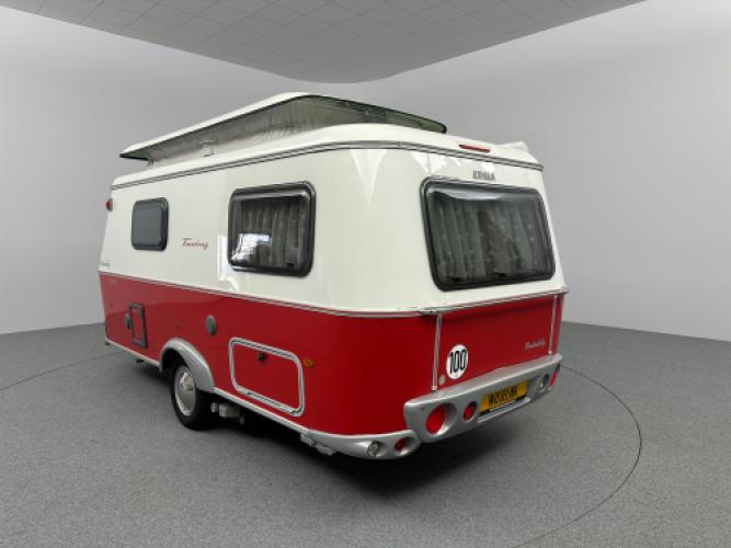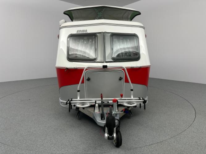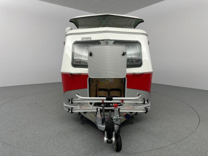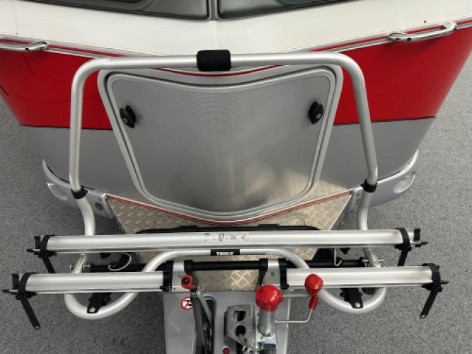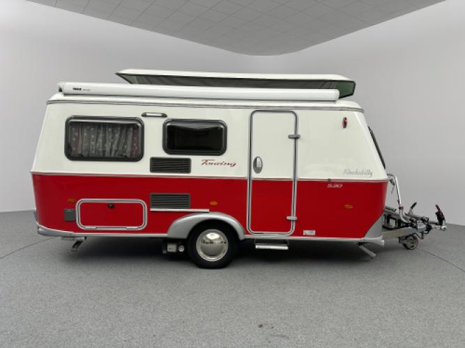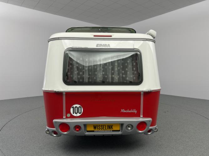 De Rockabilly editie van de Eriba Touring Troll 530 springt direct in het oog met zijn opvallende rood-witte retrodesign. Binnenin wordt u verrast door een sfeervol interieur in jaren ’50 diner-stijl, met rode bekleding en karakteristieke vintage accenten. Er is sprake van wat cosmetische puntjes, wat geen invloed heeft op de functionaliteit van de caravan. Ondanks zijn klassieke uitstraling is deze uitvoering voorzien van moderne gemakken, zoals een Thule cassetteluifel, Truma mover en Thule fietsendrager, comfortabele kussens en stijlvolle vloerbedekking.