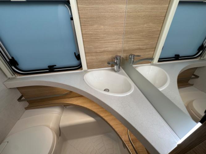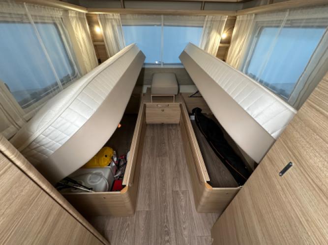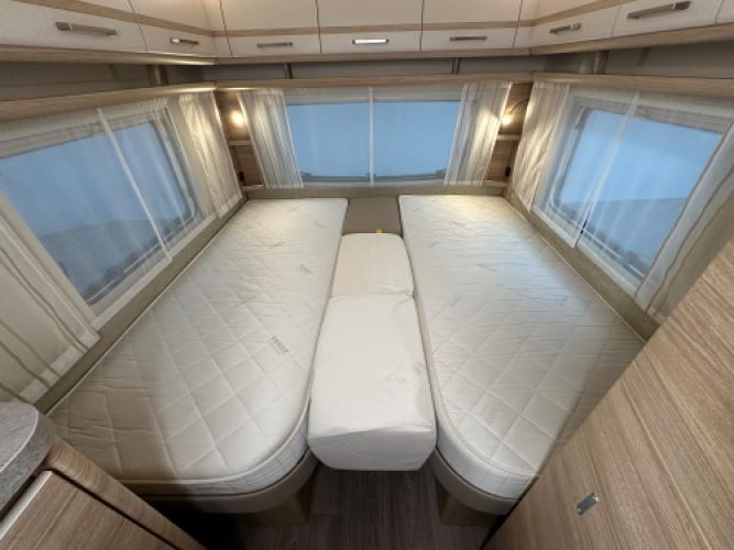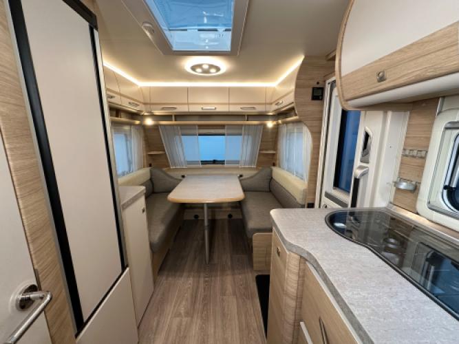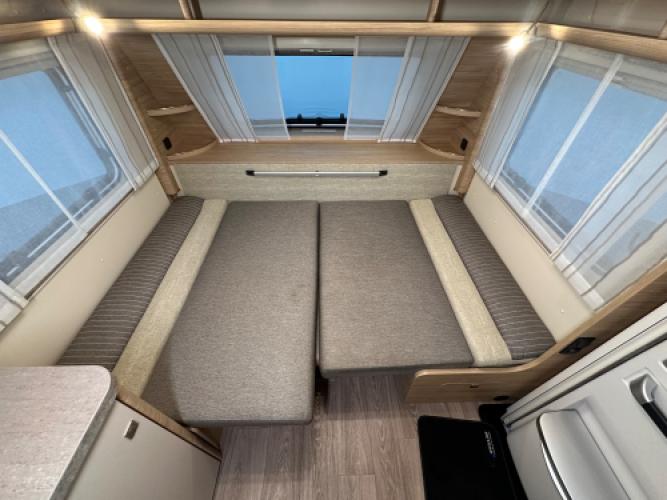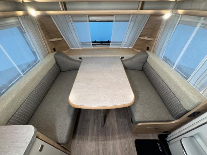 | Voorzijde | Ruime dinette om te bouwen tot tweepersoonsbed en dankzij de extra kussentjes kunt u net als in een rondzit gewoon languit, met de beentjes hoog. |