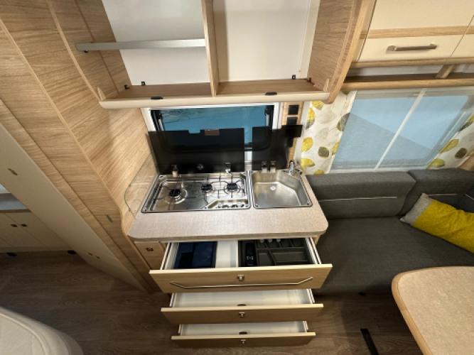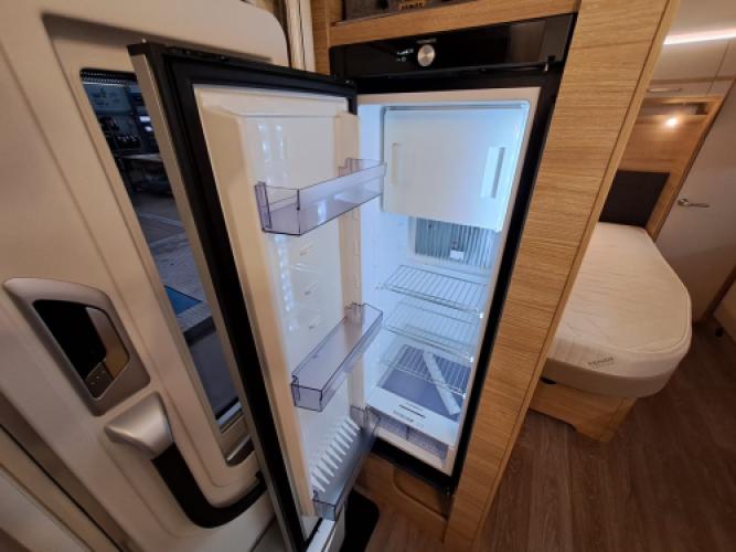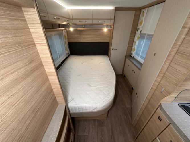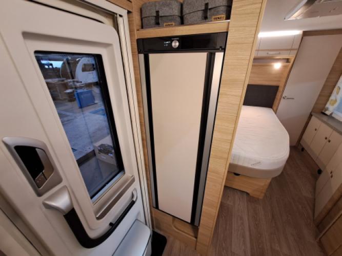 | Midden | Frans bed in lengterichting, veel kastruimte en praktische keuken met hoog model koelkast met Dual Door. |