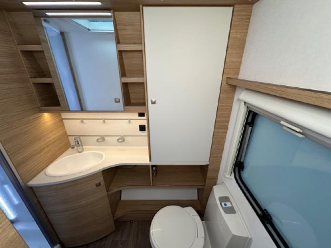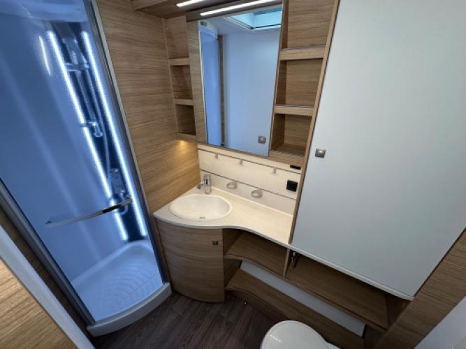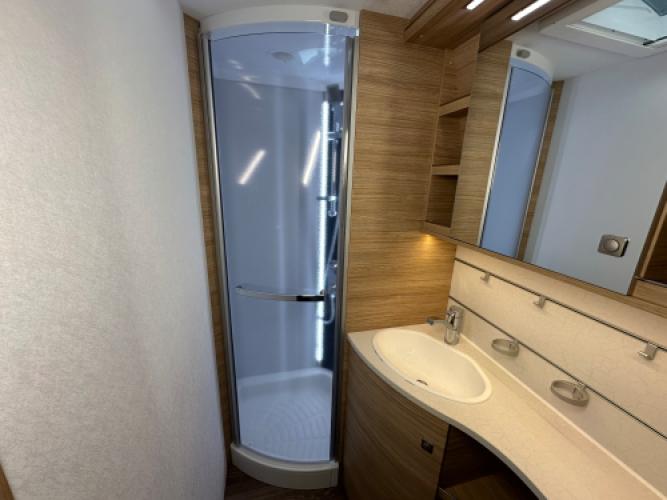 | Achter | Volwaardige badkamer zoals thuis over de gehele breedte van de caravan inclusief douchecabine. |