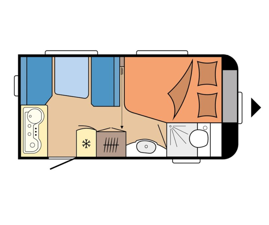 | Voorzijde | Frans bed met daarnaast de toiletruimte en een externe wastafel. |