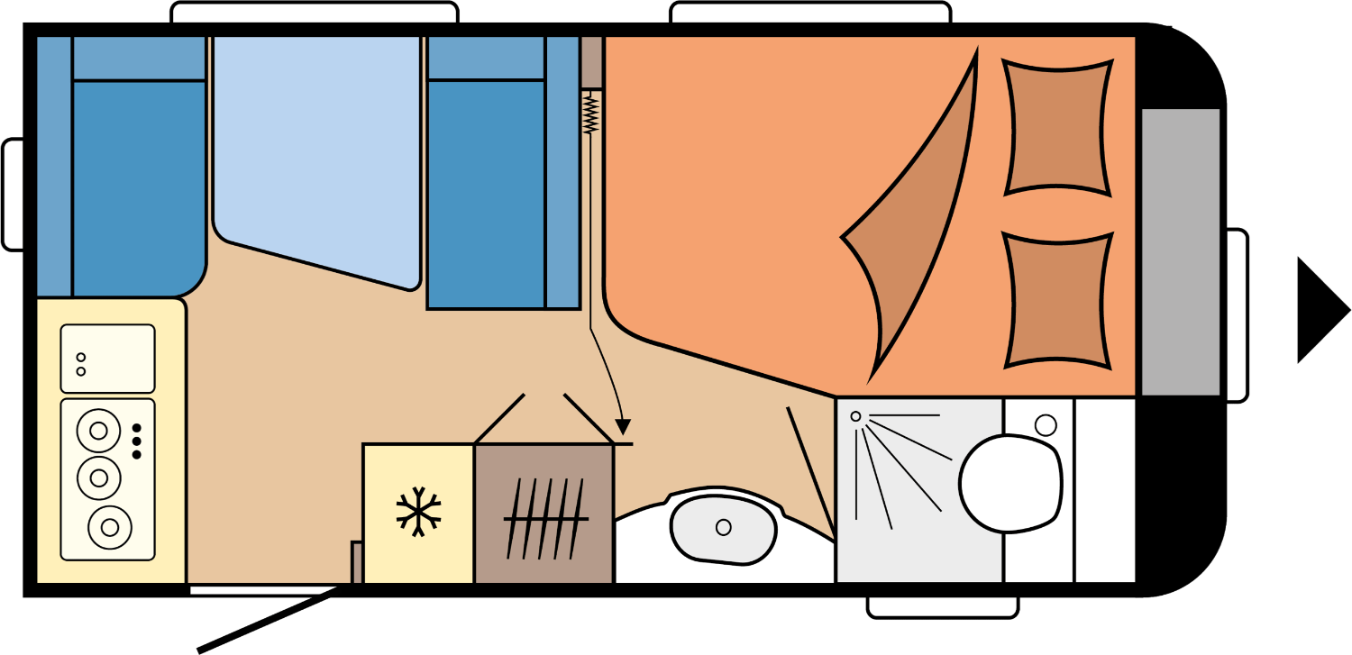 | Achter | Ruime keuken met daarnaast treinzit wat je kunt ombouwen tot een tweepersoonsbed. |