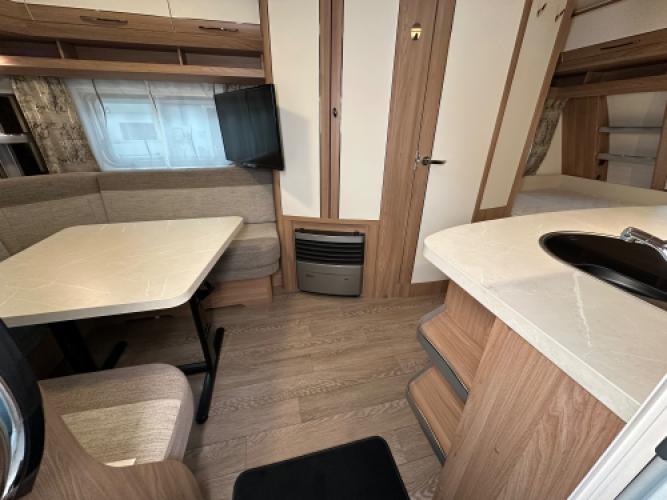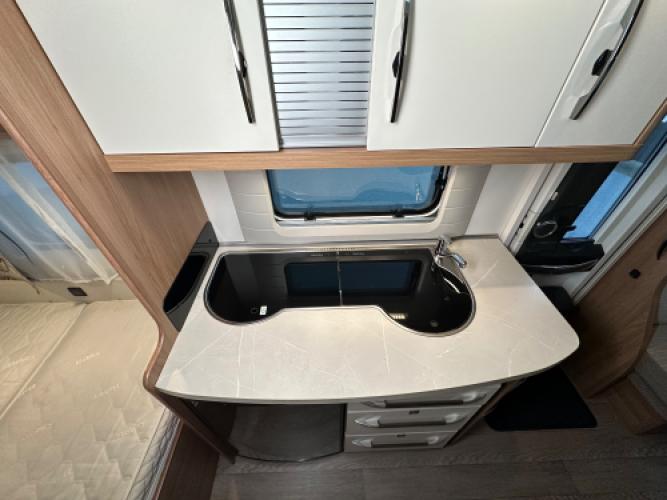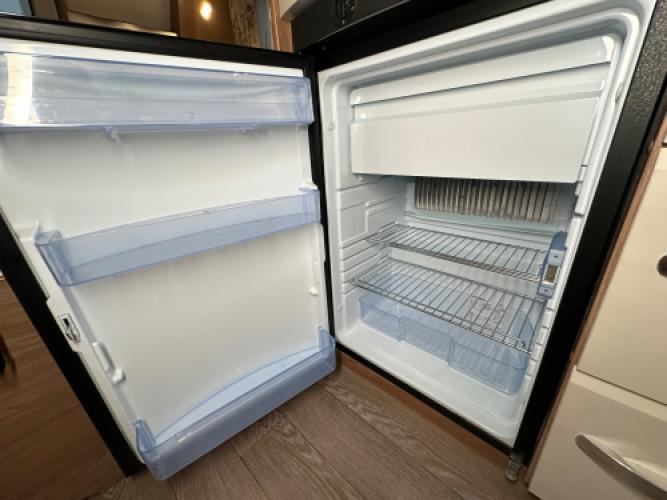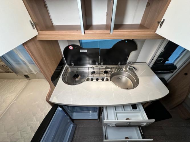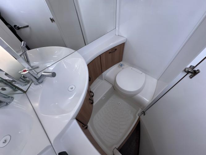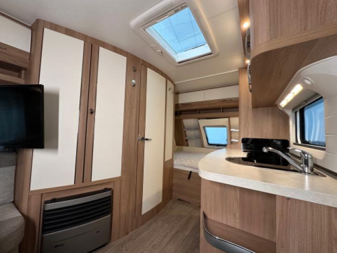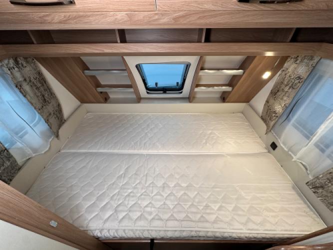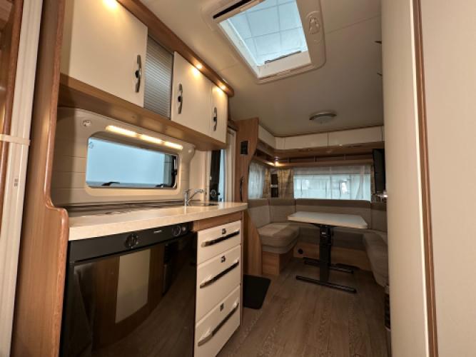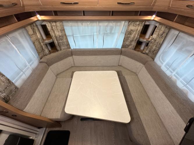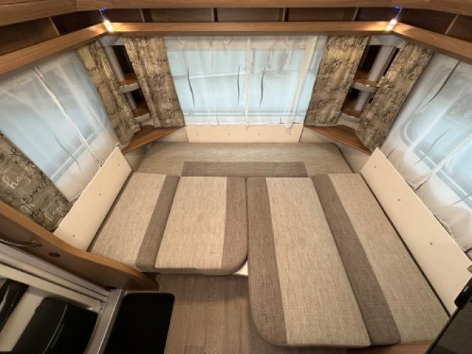 Deze Hobby De Luxe 455 UF is een praktische en comfort indeling, achterin de caravan bevindt zich een rondzit wat u kunt ombouwen tot extra slaapplekken, de caravan heeft een dwarsbed met hieronder opbergruimte. De caravan beschikt veel luxe opties zoals, Reich Mover, Zakluifel met voorwand en zijwanden en een Thule kantelbare fietsendrager. Wanneer u nu bij ons een caravan of camper aanschaft, kunt u gebruikmaken van onze stallingsmogelijkheid. De caravan of camper kan kosteloos tot en met het voorjaar bij ons blijven staan, zodat u rustig de tijd heeft om een geschikte stalling bij u in de buurt te vinden. Vraag onze medewerkers naar de voorwaarden.
