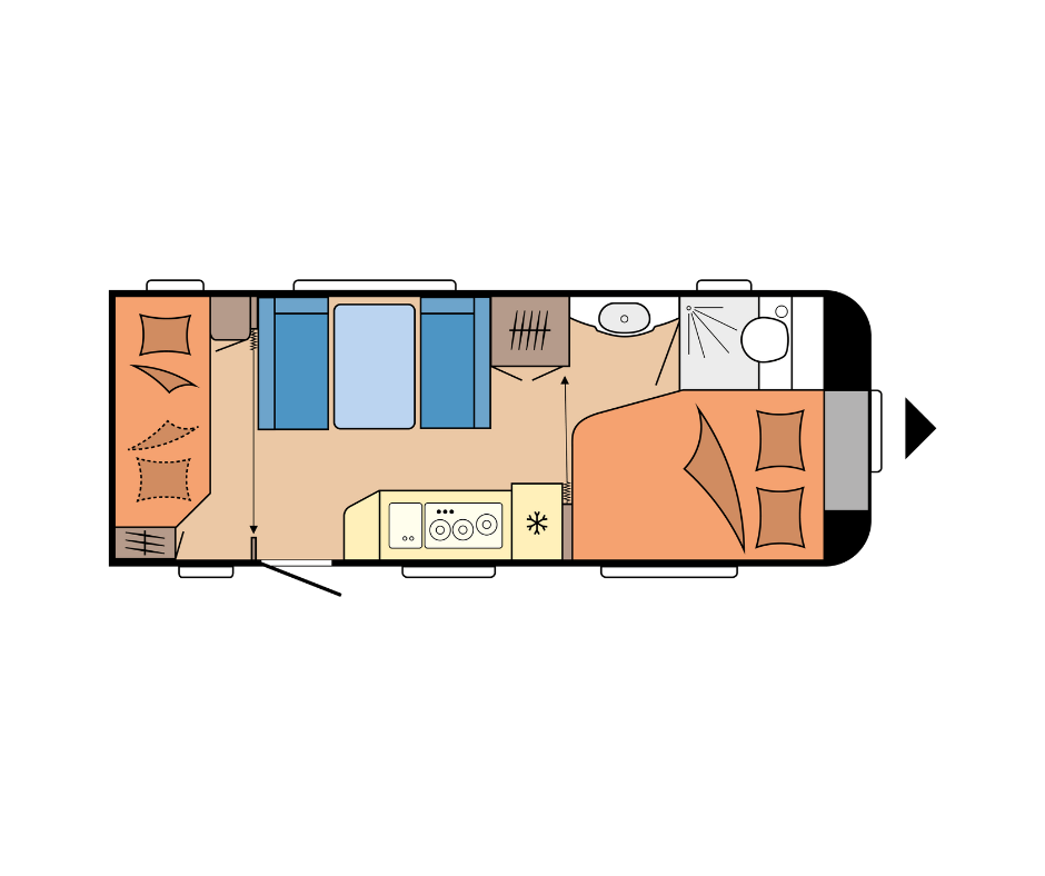 | Midden | Keuken met hiertegenover de rondzit, die eenvoudig is om te bouwen naar extra slaapplaatsen. |