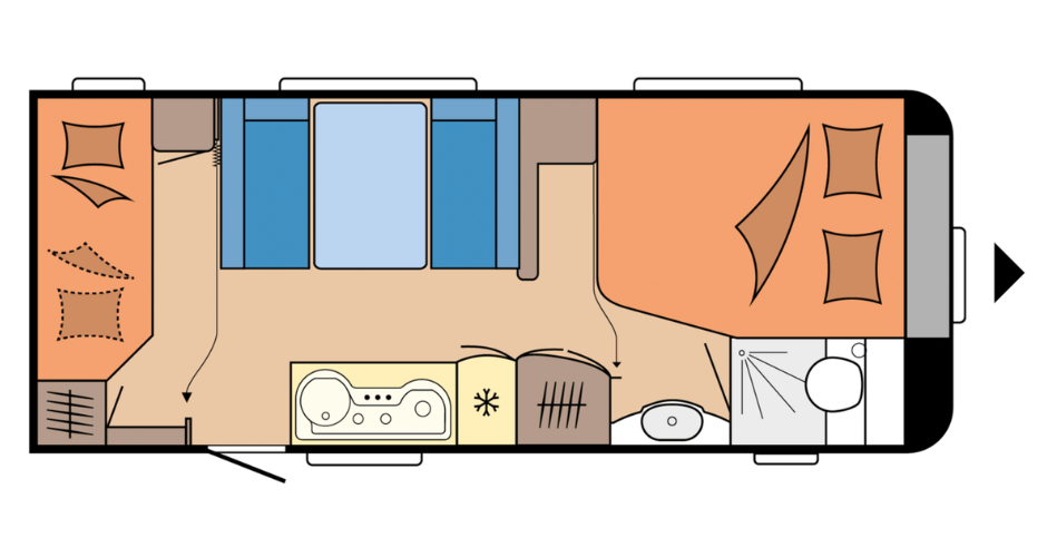| Midden | Keuken met hiertegenover een ruime dinette welke eenvoudig is om te bouwen naar extra slaapplekken. |