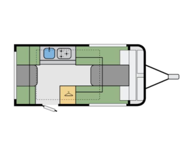 | Voorzijde | Grote dinette welke je kan ombouwen tot enkele bedden of 1 groot bed. |