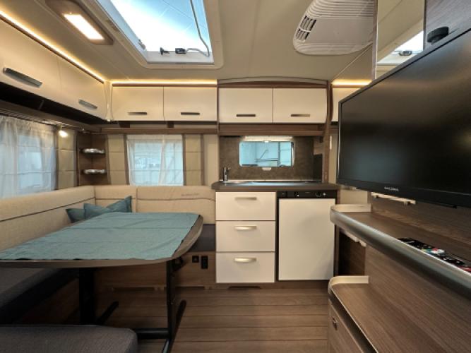 Deze mega stoere Knaus Sport 450 FU Silver Edition is voorzien van vele luxe opties om uw reis helemaal compleet te maken! Binnenin ziet u de hoogwaardige afwerken en sfeervolle verlichting waar Knaus ook wel bekend om staat. De Knaus is uitgerust met een Webasto dakairco, Thule cassetteluifel, Reich mover en een Thule fietsendrager. Oftewel het hele kampeerpakket! Er is sprake van lichte puntjes van hagel op het front, wat geen invloed heeft op de functionaliteit van de caravan. Vandaar de scherpe prijs.