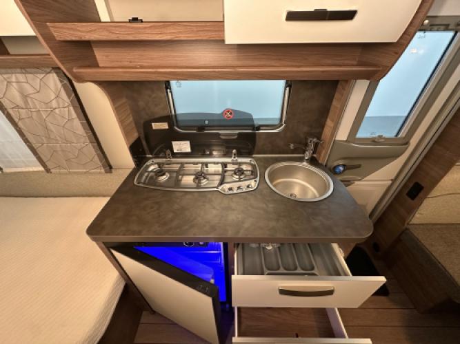 Deze stoere Knaus Sport 460 EU Silver Selection is uitgerust met alle opties die u nodig heeft om uw vakantie helemaal compleet te maken. Voorzien van een Dorema voortent, Thule fietsendrager (E-bike geschikt) en een Berger Campingkeuken XL. Dit is een opvouwbare keuken die koken op de camping een stuk praktischer én gezelliger maakt! Dankzij het stevige frame en de ruime opbergvakken staat hij in één handomdraai klaar en heeft u alle kookspullen overzichtelijk bij de hand. Voorzien van enkele bedden welke u kunt ombouwen tot tweepersoonsbed door het rolbed. Wanneer u nu bij ons een caravan of camper aanschaft, kunt u gratis gebruikmaken van onze stallingsmogelijkheid. De caravan of camper kan kosteloos tot en met het voorjaar bij ons blijven staan, zodat u rustig de tijd heeft om een geschikte stalling bij u in de buurt te vinden. Vraag onze medewerkers naar de voorwaarden.