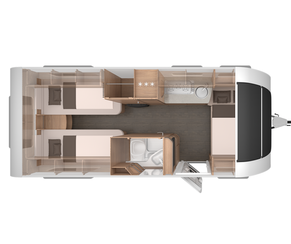 | Voorzijde | Enkele bedden en rolbed met veel opbergruimte hieronder. |