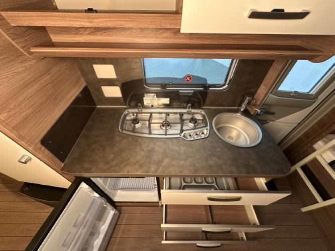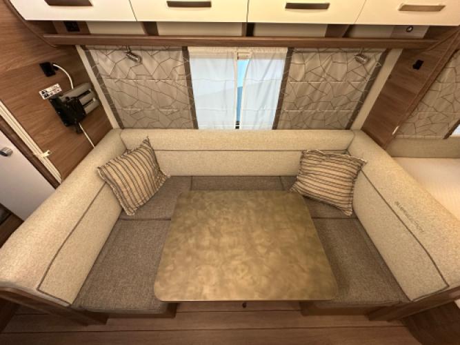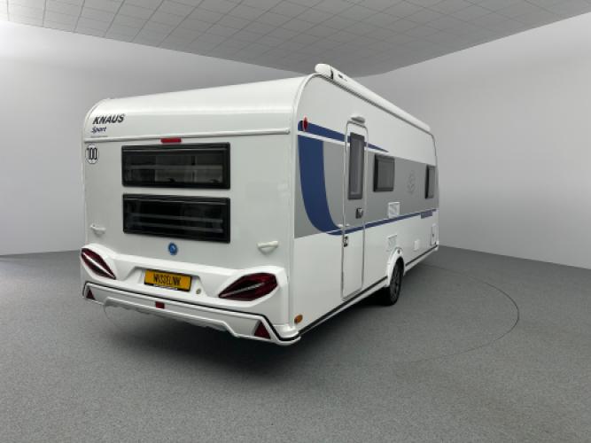 De Knaus Sport 550 FSK Silver Selection is een moderne en compleet uitgeruste gezinscaravan die bekendstaat om zijn ruime indeling, hoogwaardige afwerking en comfortabele voorzieningen. Dankzij de slimme combinatie van een frans bed, stapelbedden en een grote rondzit biedt deze caravan plaats aan maximaal zes personen, waardoor hij ideaal is voor gezinnen die graag met voldoende leefruimte op pad gaan. De Silver Selection‑uitvoering staat bekend om zijn rijke standaarduitrusting. Denk hierbij aan lichtmetalen velgen, buitenlamp, hordeur en serviceluik.