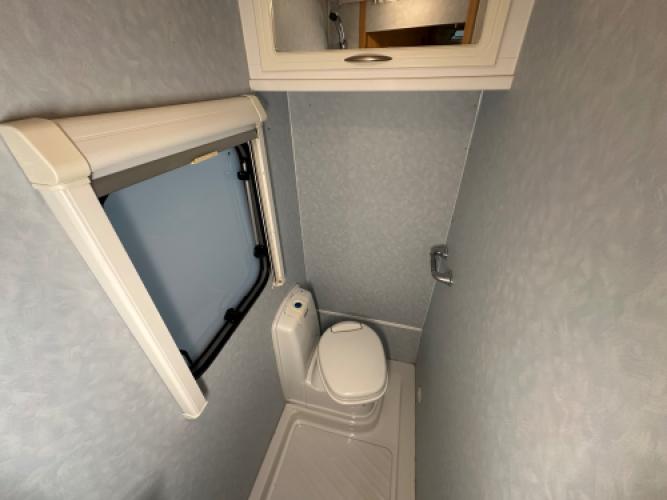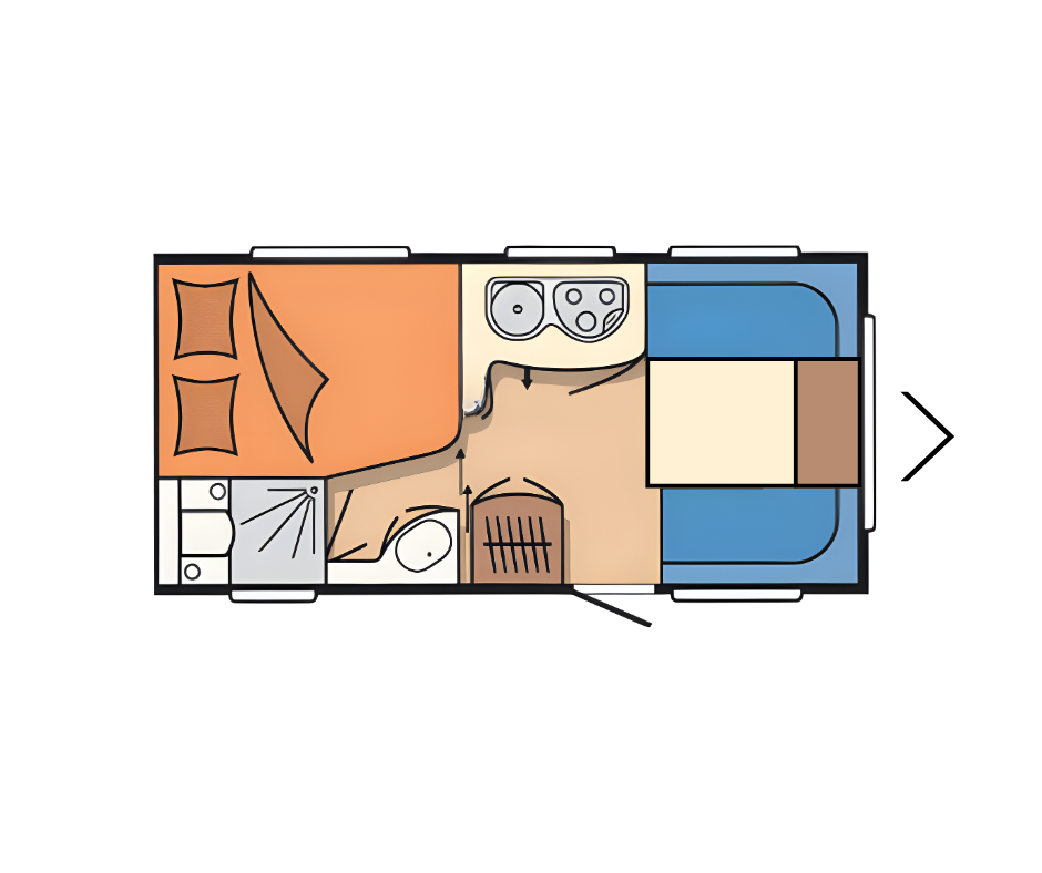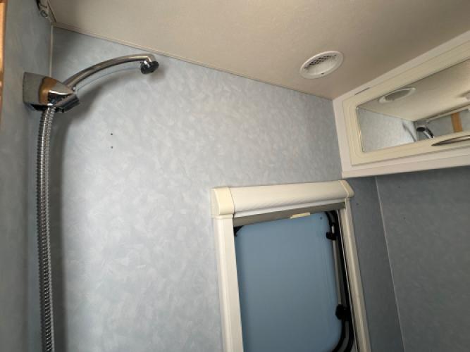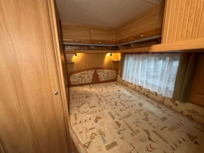 | Achter | Frans bed met hieronder veel opbergruimte met in de hoek de badkamer en externe wastafel. |