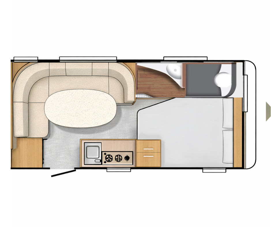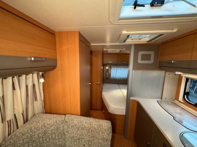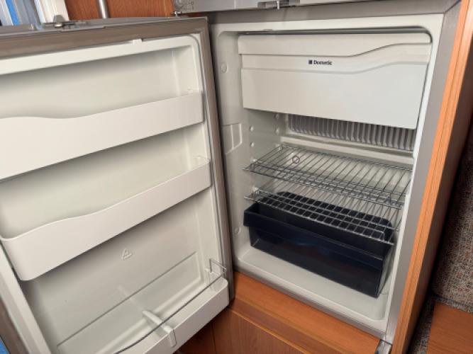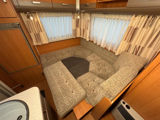 | Achter | Rondzit die eenvoudig is om te bouwen tot extra slaapplaatssen, met hiernaast koelkast. |