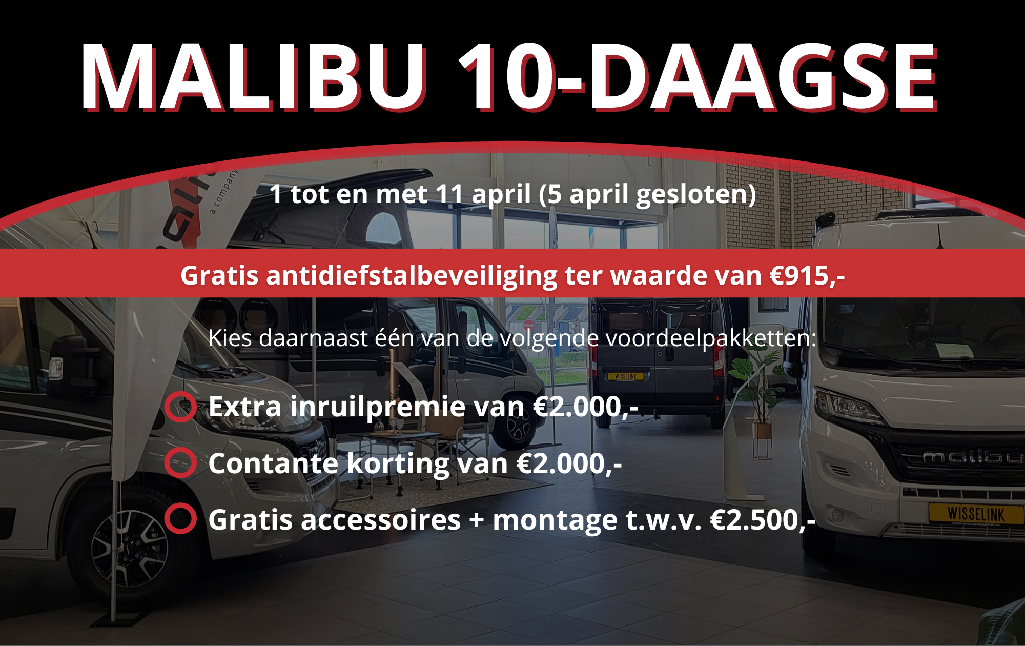 Contante korting van €2000,- Extra inruilpremie van €2000,- Gratis accessoires inclusief montage t.w.v. €2500,- *Actievoorwaarden gelden, alleen tijdens de Malibu 10-daagse, voor al onze nieuwe Malibu buscampers.