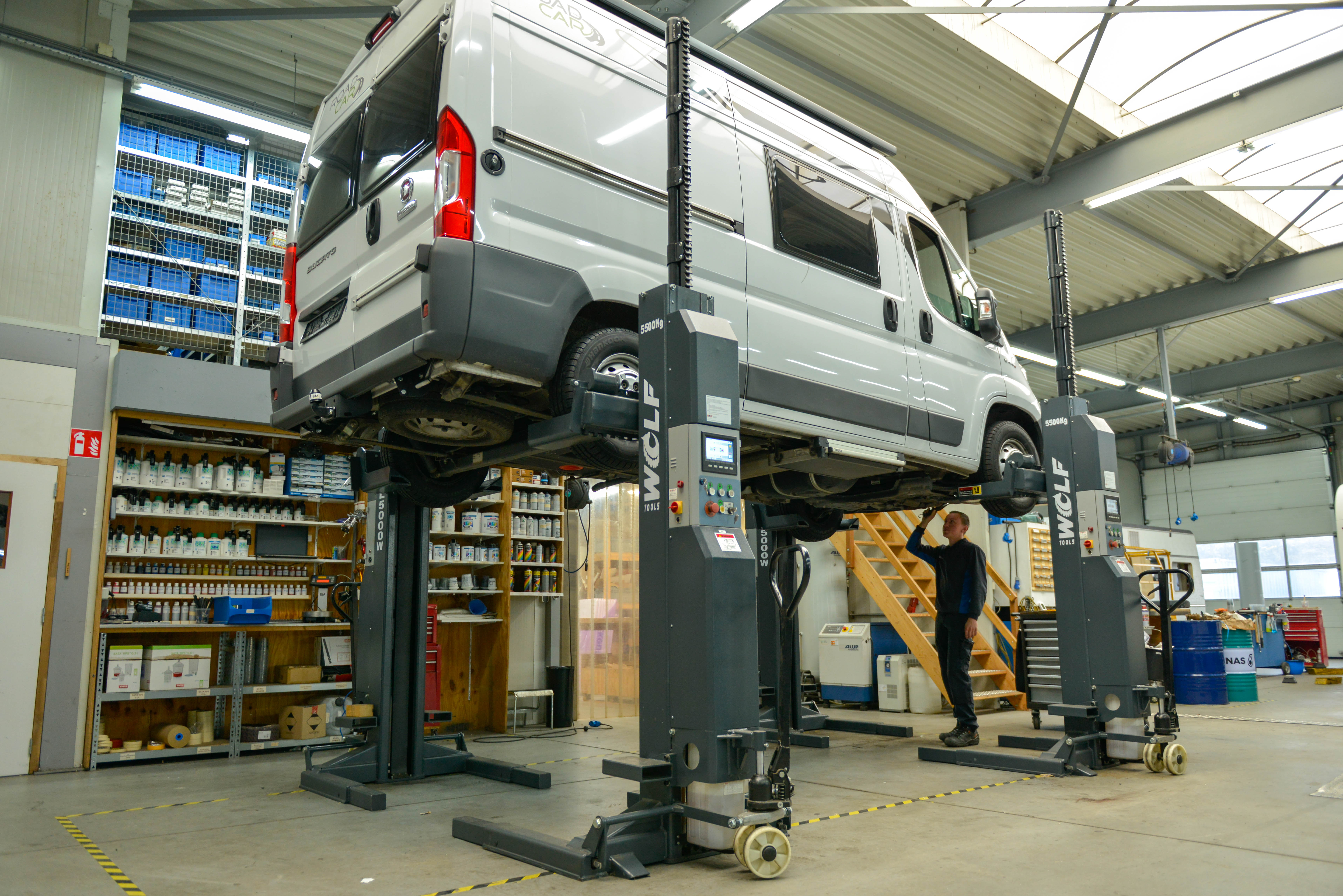 Comfortabel werken dankzij moderne apparatuur zoals onze 5 tons hefbruggen met krik speciaal voor campers